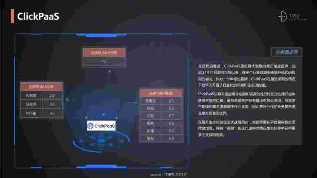 T研究认为,,,在低代码赛道,,,NO钱包是极具代表性的海归创业品牌,,自2017年产品面向市场以来,,在多个行业领域率先展开低代码应用的尝试。。。。作为一个年轻的品牌,,,NO钱包较早的开展了行业化的深耕和生态的构建。。NO钱包以丰富的组件功能和较高的性价比在企业用户当中获得不错的口碑,,在客户规模和知名度都属于行业头部,,因此在行业化的业务复杂度支撑方面表现优异。。。。